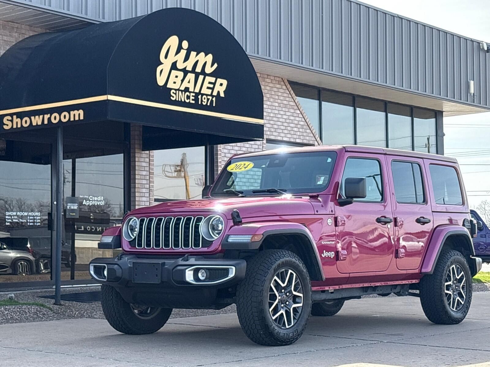 1 owner, local trade. Perfect Carfax History!! 2024 Jeep Wrangler 4-Door Sahara 4x4 Limited Edition Tuscadero Pearl Exterior, Black Interior This 2024 Jeep Wrangler Sahara blends legendary off-road capability with modern comfort and technology. Powered by a 3.6L V6 engine with Stop/Start and paired with an 8-speed automatic transmission , it delivers smooth performance on highways and trails alike. Its Command-Trac 4WD system and 3rd Generation Dana solid rear axle make tackling rugged terrain effortless, while safety features like Full-Speed Forward-Collision Warning, Advanced Brake-Assist, Adaptive Cruise Control with Stop, ParkView Rear Backup Camera, Blind-Spot and Cross-Path Detection, and ParkSense Rear Park-Assist keep every drive secure. Inside, enjoy a tech-forward cabin with a 12.3-inch Uconnect touchscreen , Apple CarPlay, Android Auto, Alpine premium audio system, GPS navigation, integrated off-road camera, heated front seats and steering wheel, and premium McKinley-trimmed seats with power adjustments for driver and passenger. Exterior highlights include 18-inch machined wheels , all-terrain tires, LED headlamps and tail lamps, a body-color 3-piece hardtop, Sunrider soft top, and Mopar black tubular side steps. Additional features include trailer tow and auxiliary switches, hardtop headliner, and all-weather floor mats for adventure-ready convenience. Comes with our lifetime engine warranty up to $4,000 "if" you get your oil changes done here and get the BG additive applied every visit! You're not just a number here at Jim Baier, our #1 priority is taking care of you before, during, and after the sale! We strive to build a lasting relationship with our customers and service their transportation needs for life! And that's what has given us the privilege of being named the #1 rated dealer in Southeast Iowa. Come experience the difference! Call/text (319) 371-4268, or email us at JESSE@jimbaier.com before you stop in to make sure this vehicle is still available and we'll have it pulled up front when you arrive!